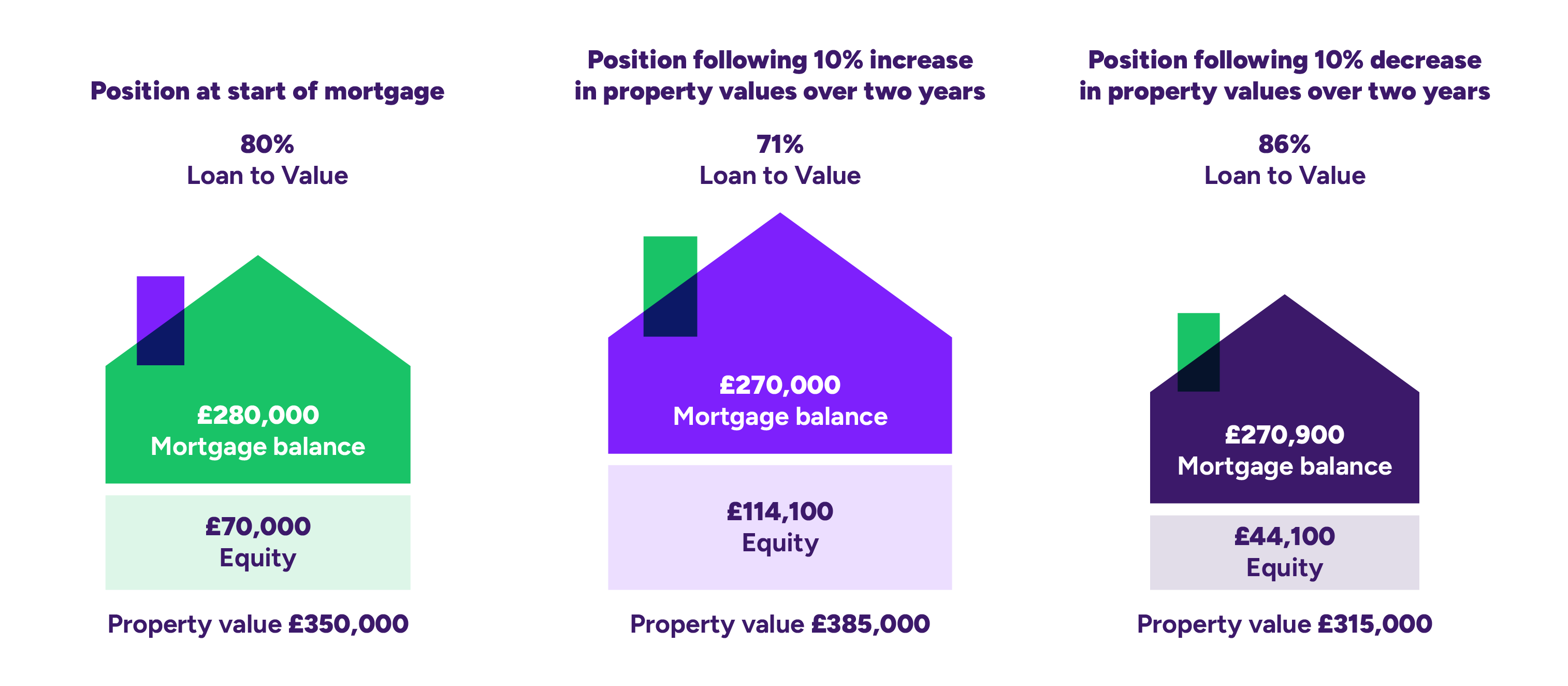 Below are examples of how the LTV can change over a two year period when the value of a property goes up or down.